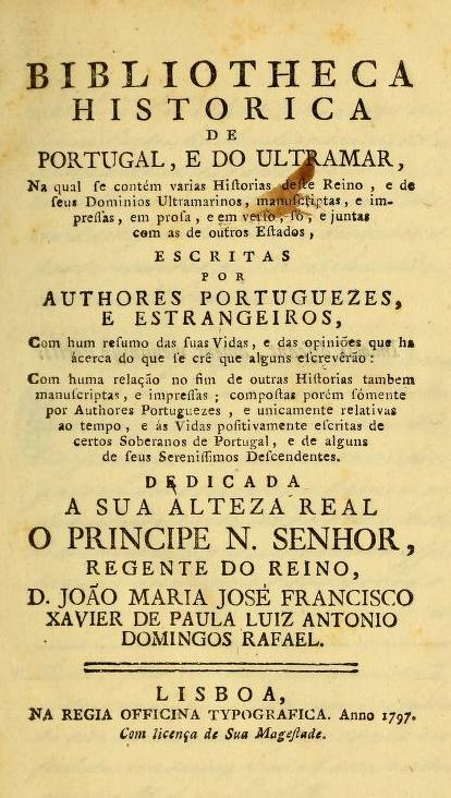 Bibliotheca historica de Portugal, e do Ultramar, : na qual se contém varias historias deste reino, e de seus dominios ultramarinos, manuscriptas, e impressas, em prosa, e em verso, só, e juntas com as de outros estados, (1797)