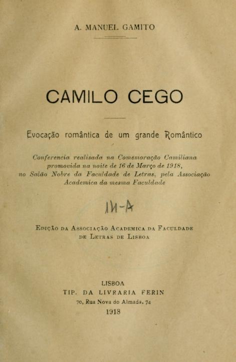 _: Camilo cego, evocação romântica de um grande romântico. Edição da Associação academica da Faculdade de letras de Lisboa (1918)