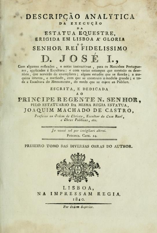Descripção analytica da execução da estatua equestre erigida em Lisboa á gloria do senhor rei fidelissimo D. José I. : com algumas reflexões, e notas instructivas, para os mancebos portuguezes, applicados á escultura : e com varias estampas que mostrão os desenhos, que servirão de exemplares : alguns estudos que se fizerão : a maquina interna, e methodo, com que se construio o modelo grande : e toda a escultura do monumento, do modo que se expoz ao público (1810)