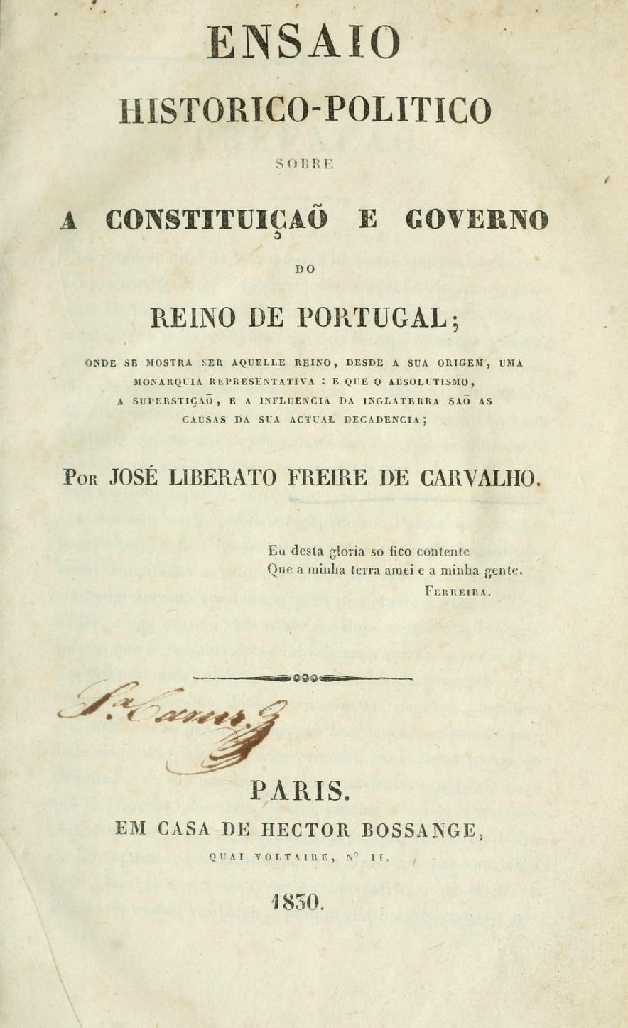 _: Ensaio historico-politico sobre a constituição e governo do reino de Portugal; onde se mostra ser aquelle reino, desde a sua origem, uma monarquia representativa: e que o absolutismo, a superstição, e a influencia de Inglaterra saõ as causas da sua actual decadencia (1830)