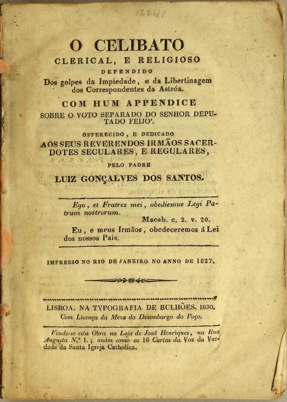 _: O celibato clerical, e religioso defendido dos golpes da impiedade, e da libertinagem dos correspondentes da Astréa. Com hum appendice sobre o voto separado do senhor deputado Feijó. (1830)
