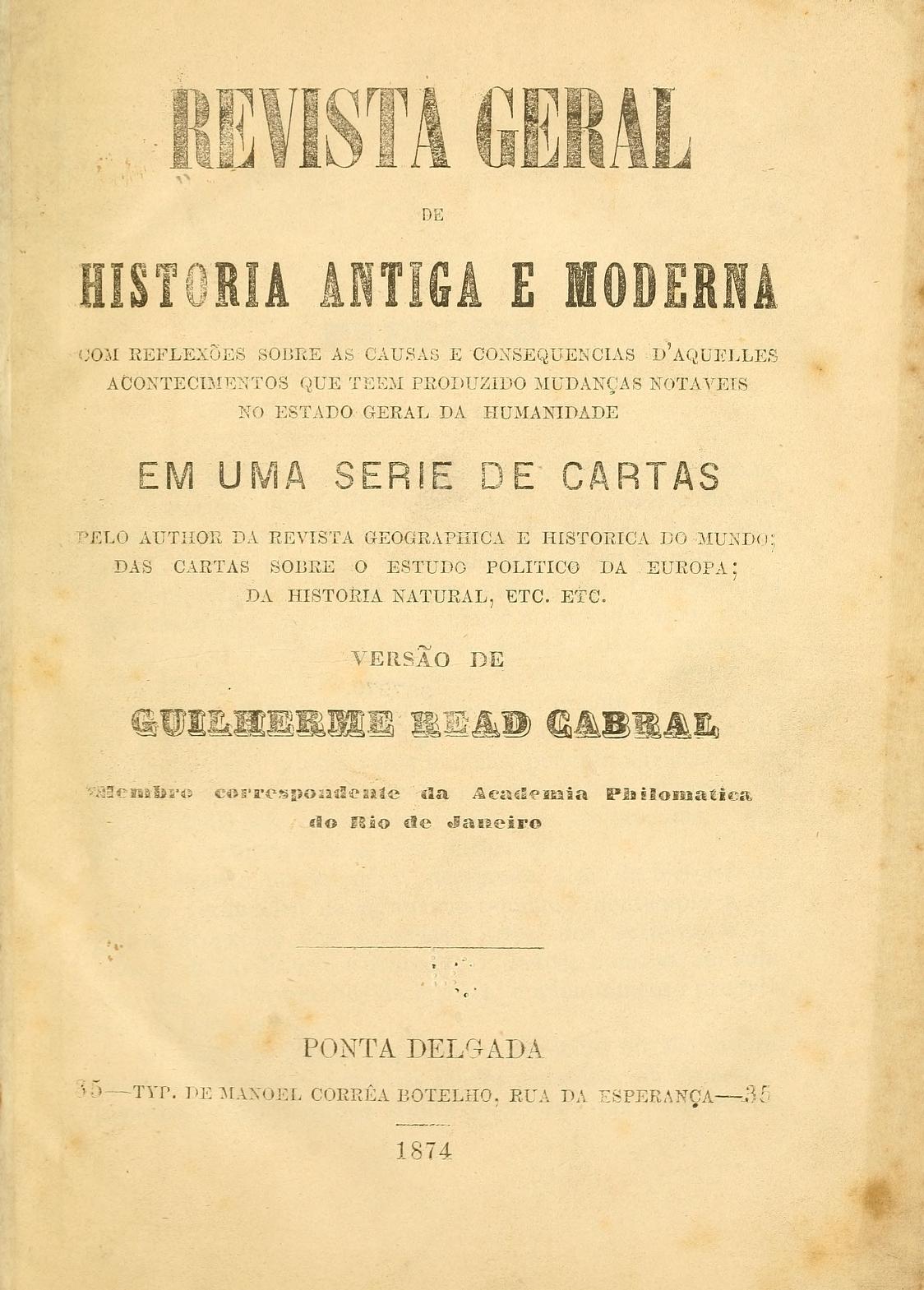Revista geral de historia antiga e moderna, com reflexões sobre as causas e consequencias d'aquelles acontecimentos que teem produzido mudanças notaveis no estado geral da humanidade (1874)