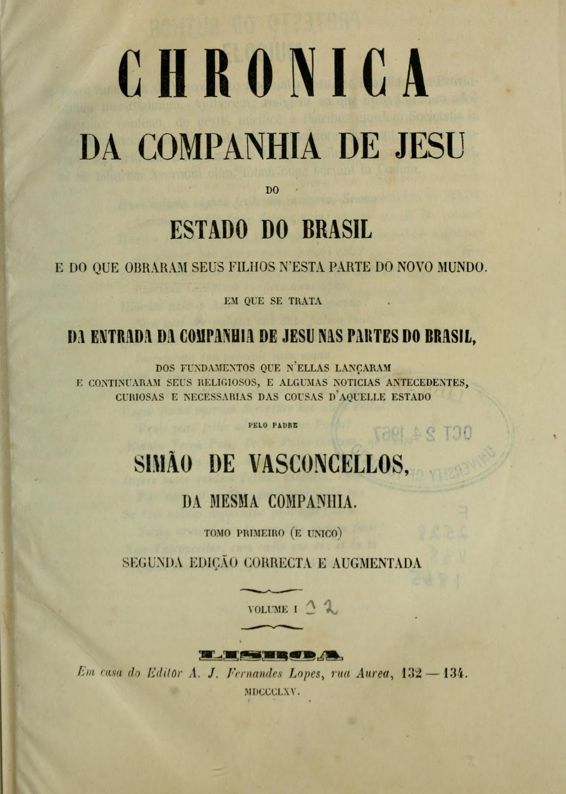 Chronica da Companhia de Jesu do estado do Brasil, e do que obraram seus filhos n'esta parte do Novo mundo. Em que se trata da entrada da Companhia de Jesu nas partes do Brasil, dos fundamentos que n'ellas lançaram e continuaram seus religiosos, e algumas Noticias antecedentes, curiosas e necessarias das cousas d'aquelle estado, pelo padre Simão de Vasconcellos. Tomo primeiro (e unico) (1865)