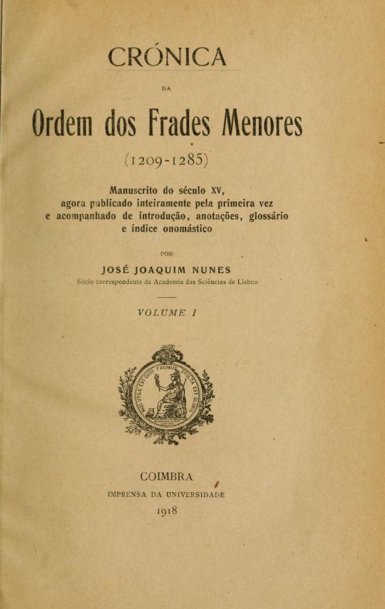 Crónica da Ordem dos Frades Menores (1209-1285) : manuscrito do século XV, agora publicado inteiramente pela primeira vez e acompanhado de introdução, anotações, glossário e indice onomástico (1918)