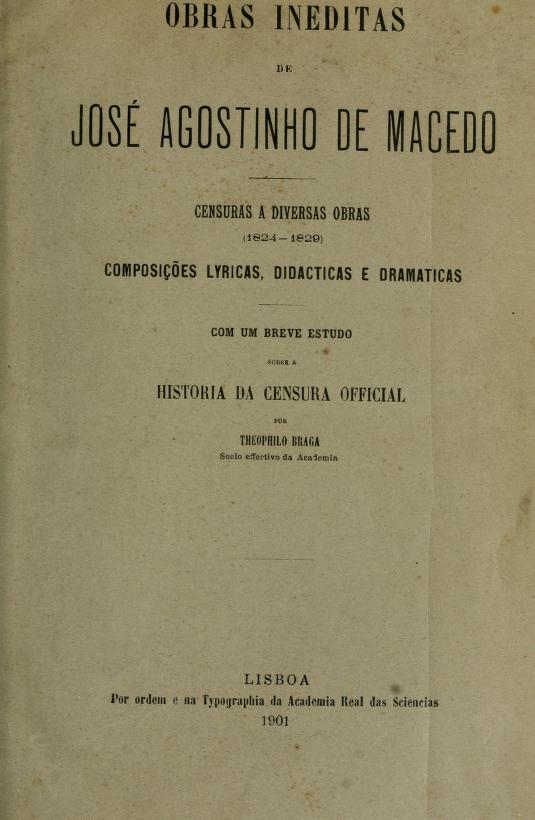Obras inéditas; censuras a diversas obras, 1824-1829; composições lyricas, didacticas e dramáticas. Com um breve estudo sobre a história da censura official por Theophilo Braga (1901)