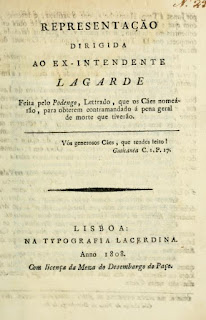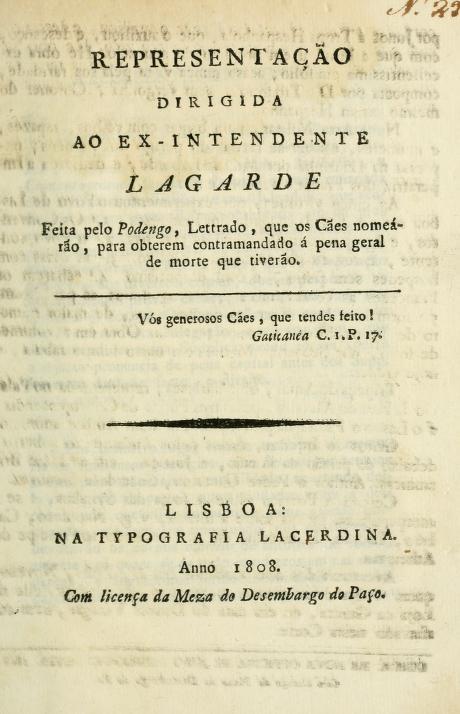 Representação dirigida ao ex-intendente Lagarde : feito pelo podengo, lettrado, que os cães nomeárão, para obterem contramandado á pena geral de morte que tiverão (1808)